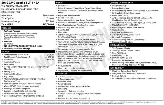 2010 GMC Acadia SLT-1 Acadia SLT-1, 4D Sport Utility, 3.6L V6 SIDI, 6-Speed Automatic Electronic with Overdrive, AWD, White Diamond Tricoat, Ebony Leather, 10 Speakers, 2-Way Power Front Passenger Seat, 3rd row seats: split-bench, Bose Advanced 10-Speaker Audio System, CD player, Cruise control, Dual SkyScape 2-Panel Power Sunroof, Emergency communication system: OnStar Directions & Connections, Front dual zone A/C, Heated Driver & Front Passenger Seats, Heavy-Duty Cooling System, Leather Shift Knob, Leather-Appointed Seat Trim, Leather-Wrapped Steering Wheel, Low tire pressure warning, Rear air conditioning, Rear-View Camera System, Remote keyless entry, Remote Vehicle Start, Security system, Steering Wheel Mounted Audio Controls, Trailer Hitch, Trailering Equipment.