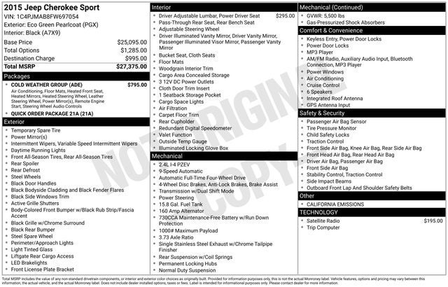 For sale: 2015 Jeep Cherokee Sport 4WD Sport Utility with the fuel-efficient 2.4L I4 MultiAir engine and 9-Speed 948TE Automatic transmission. Finished in Eco Green Pearlcoat with Black Cloth interior.