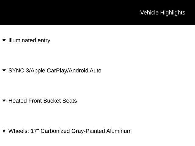 • 6 Speakers, SYNC 3 Communications & Entertainment System, Air Conditioning, Remote Keyless Entry, Emergency Communication System, Low Tire Pressure Warning, Exterior Parking Camera Rear, Fully Automatic Headlights, Security System, Cruise Control, Illuminated Entry, Reverse Sensing System, SYNC 3/Apple CarPlay/Android Auto, Wireless Charging Pad, Heated Front Bucket Seats, 17 Carbonized Gray-Painted Aluminum Wheels