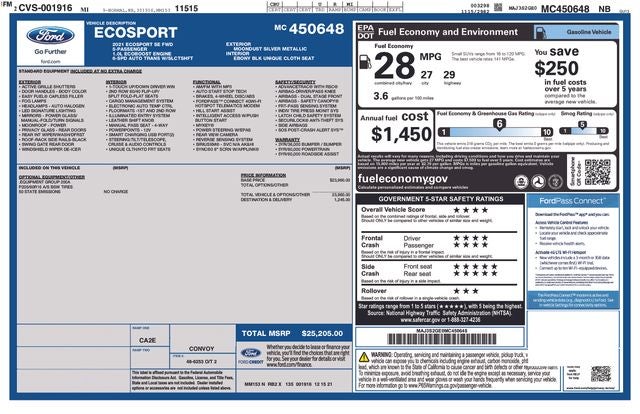 Discover the perfect blend of style, efficiency, and versatility in this 2021 Ford EcoSport SE. With its sleek silver exterior, this compact SUV is a head-turner that's ready to take on your daily adventures.