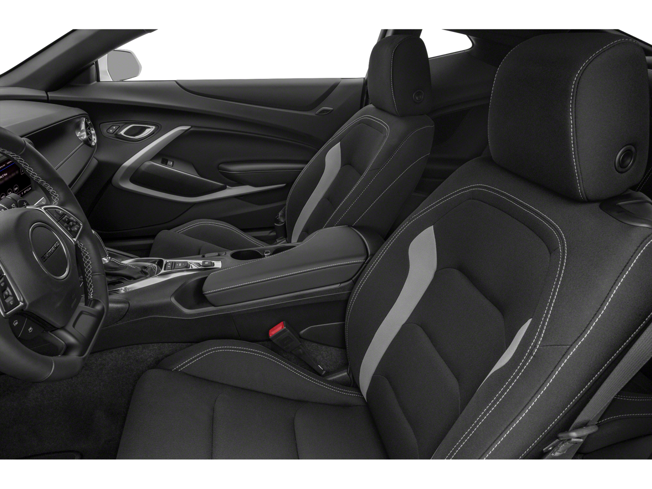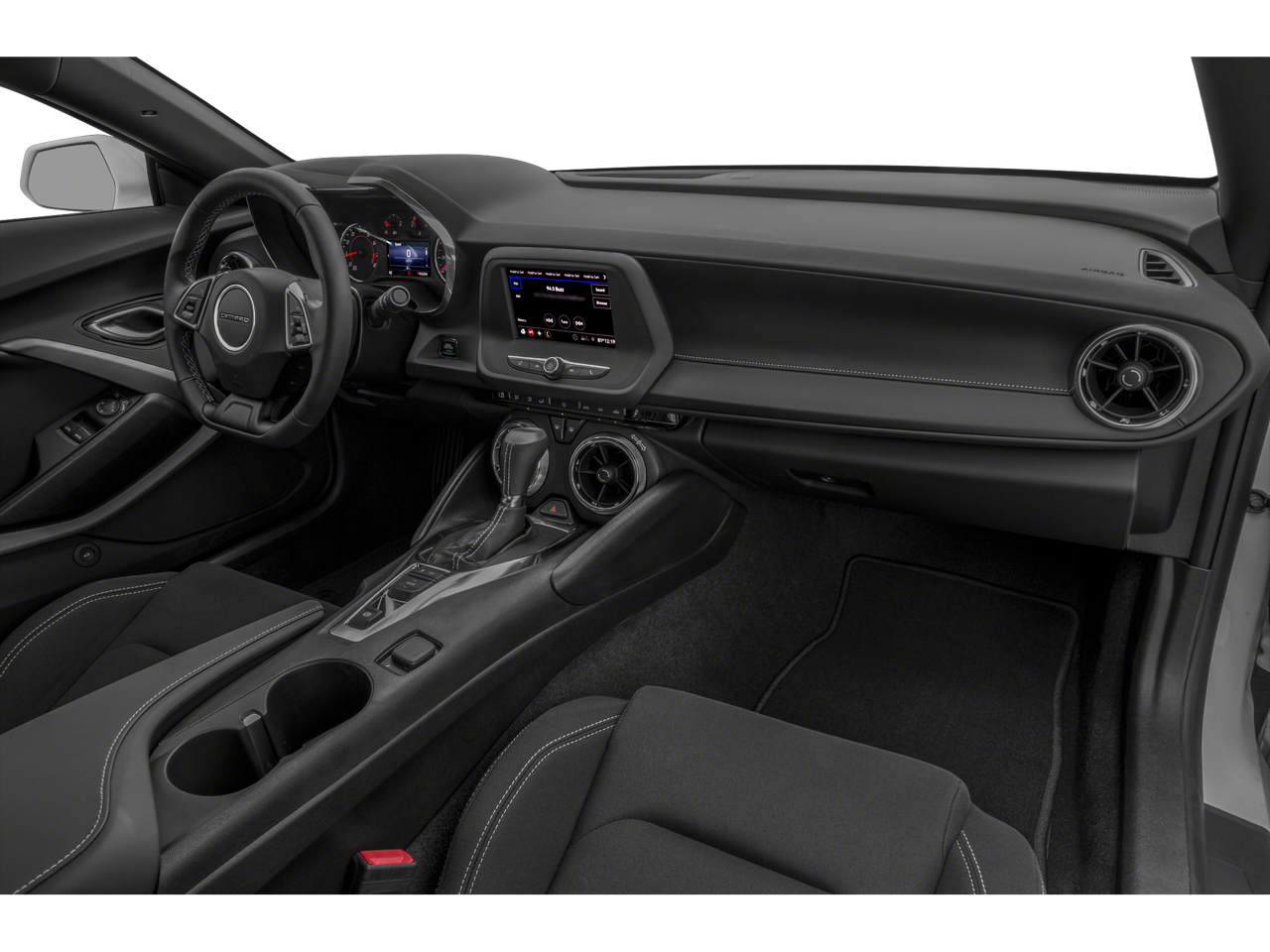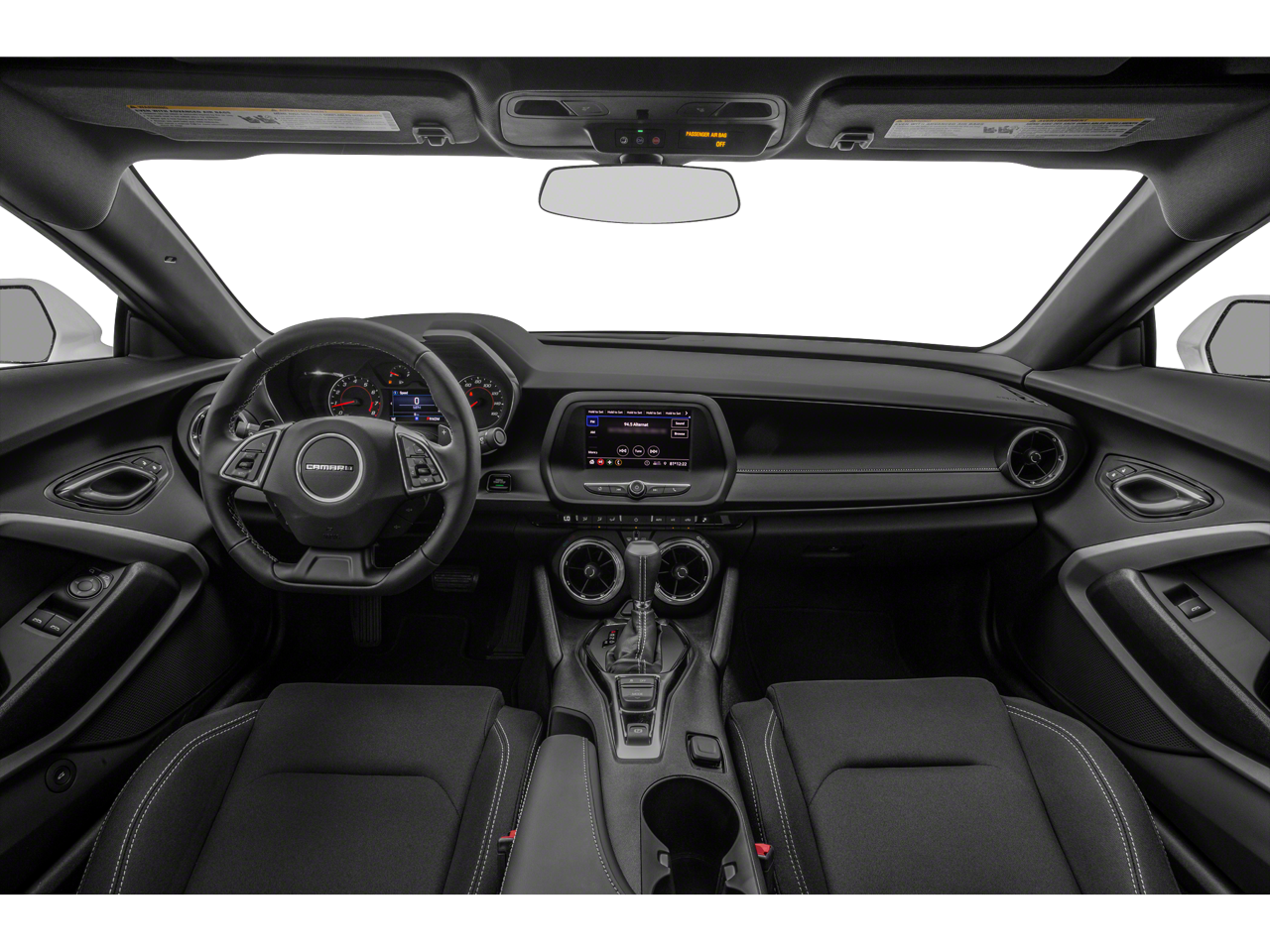 The Camaro's striking exterior design, complete with bold alloy wheels and sleek body lines, is sure to turn heads wherever you go. Step inside the well-appointed cabin and enjoy the comfort of the cloth upholstery, complemented by the leather-wrapped steering wheel and shift knob.