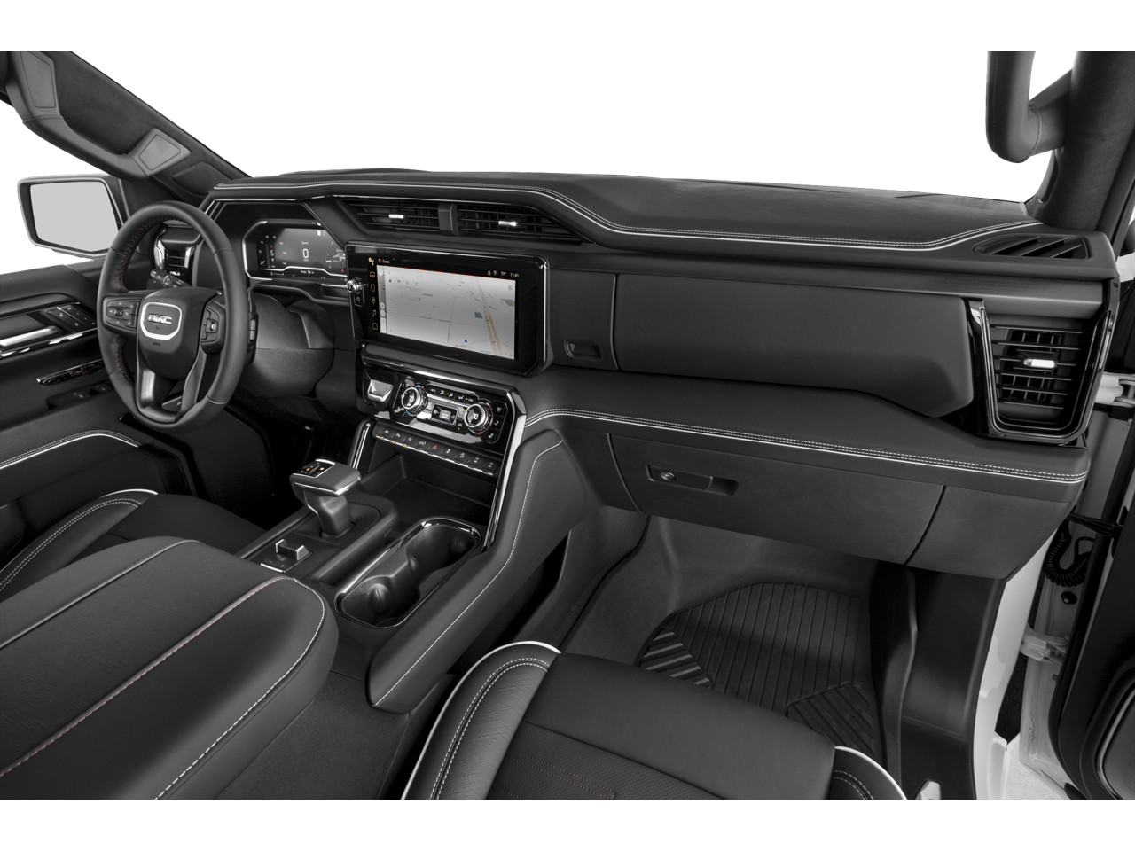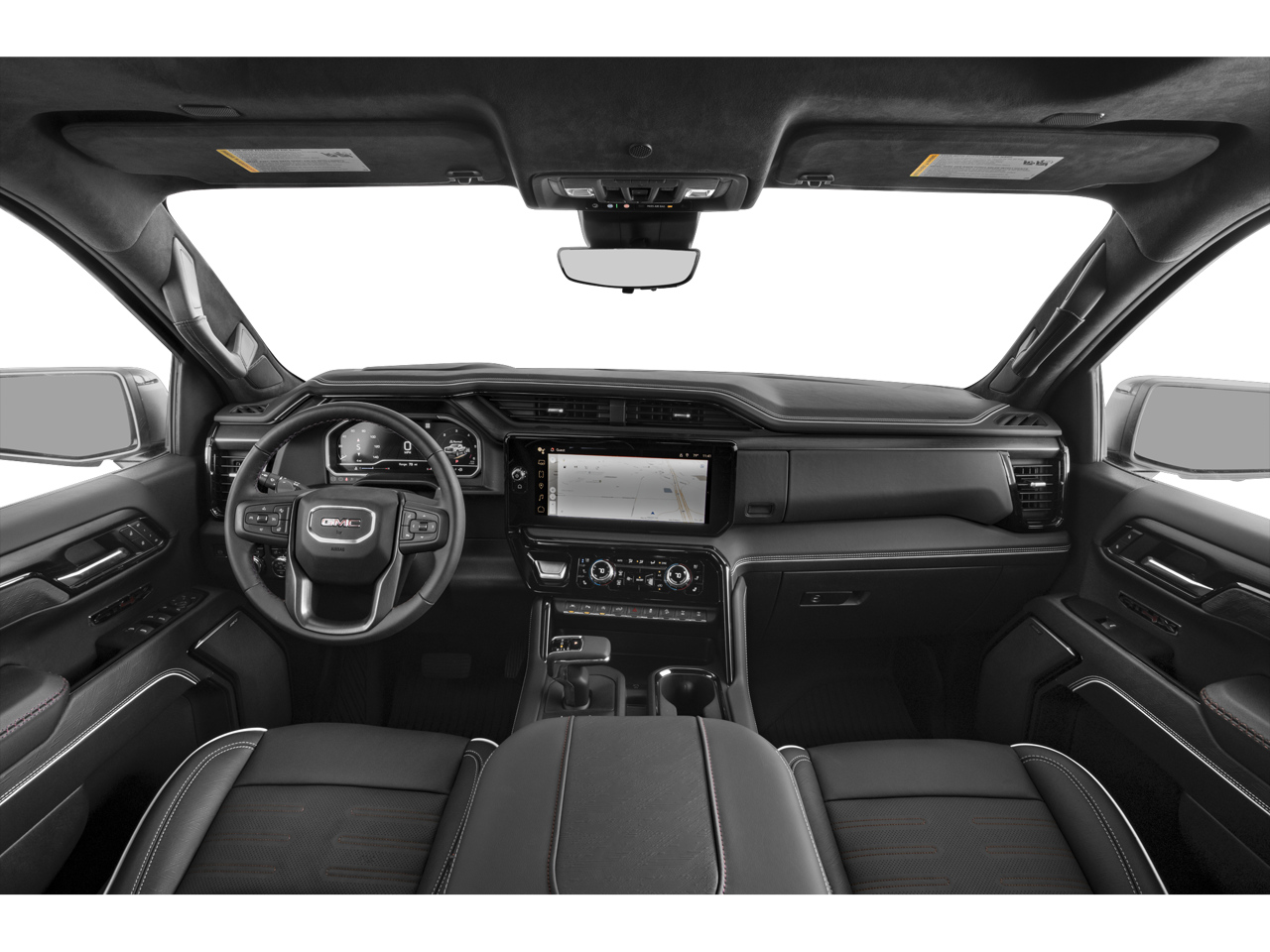 Utility & Style: Featuring the GMC MultiPro Tailgate with a Kicker Audio System, a Power Sunroof, and 18-inch Gloss Black wheels with Mud-Terrain tires.