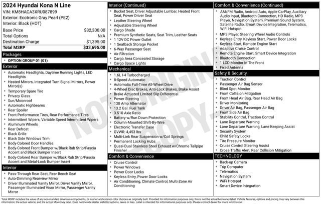 Powered by a robust I4 engine and an 8-Speed Automatic transmission, this Kona N Line delivers an impressive 24 city / 29 highway MPG, ensuring you can conquer the daily commute or embark on thrilling weekend adventures with ease. With its available All-Wheel Drive system, you'll have the confidence to tackle any road conditions Mother Nature throws your way.